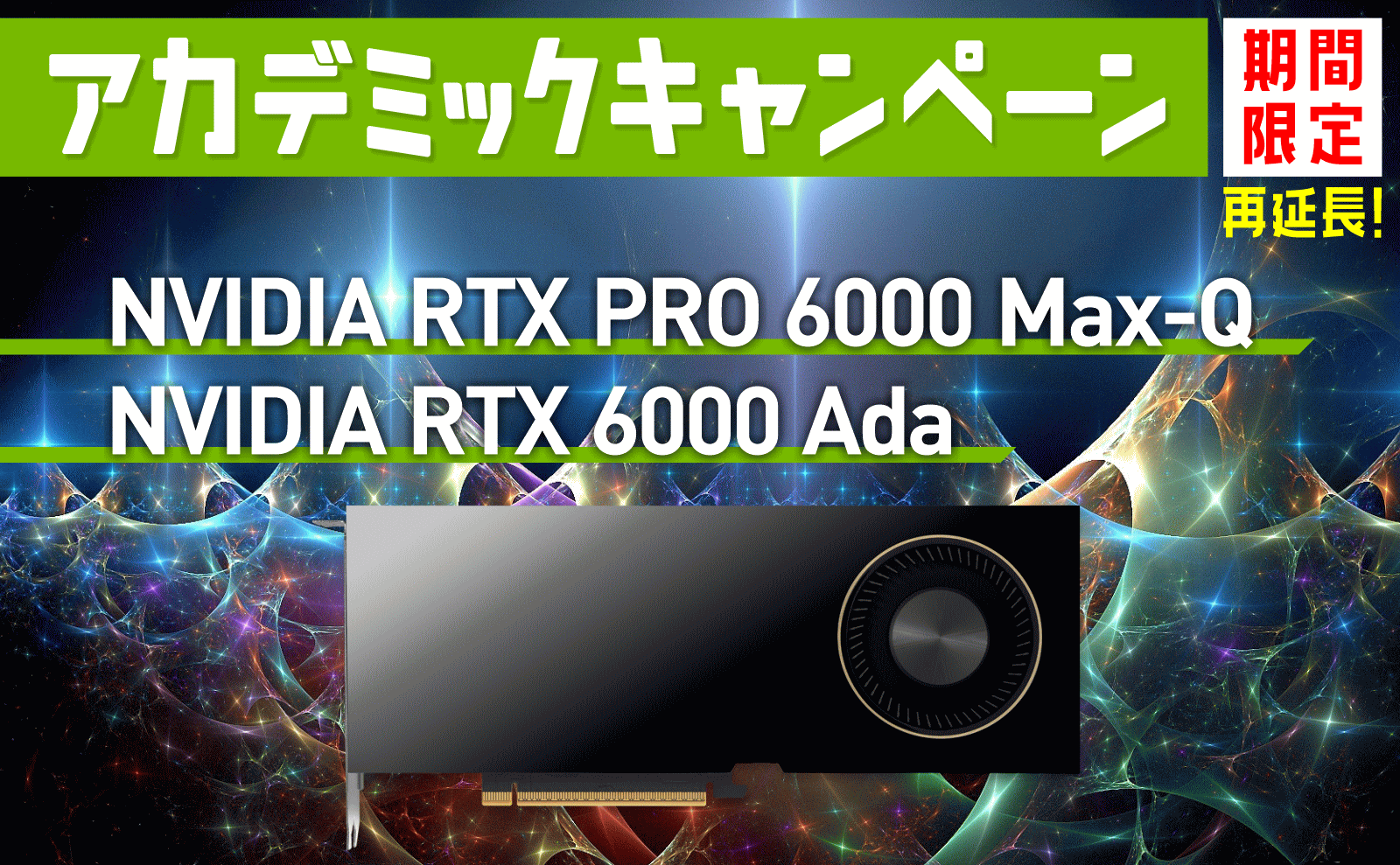 多くのお客様からのご要望をいただきましてアカデミックキャンペーンを再延長いたします。Blackwellアーキテクチャを採用した大容量メモリ搭載の NVIDIA RTX PRO 6000 Max-Q、そして現在も人気の高い NVIDIA RTX 6000 Adaの 2製品となります。GPUワークステーションや GPUラックマウントサーバと一緒にご購入されますと更に特別価格が適用されます。この機会に是非ともご検討ください。