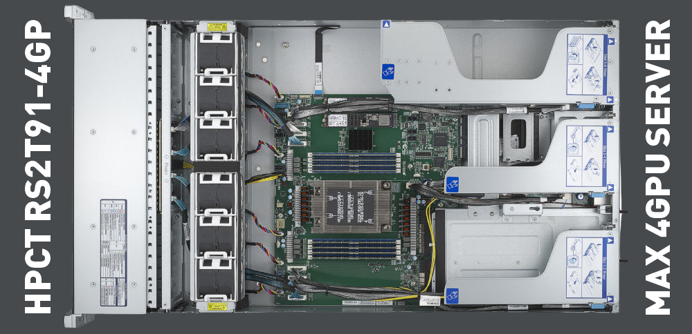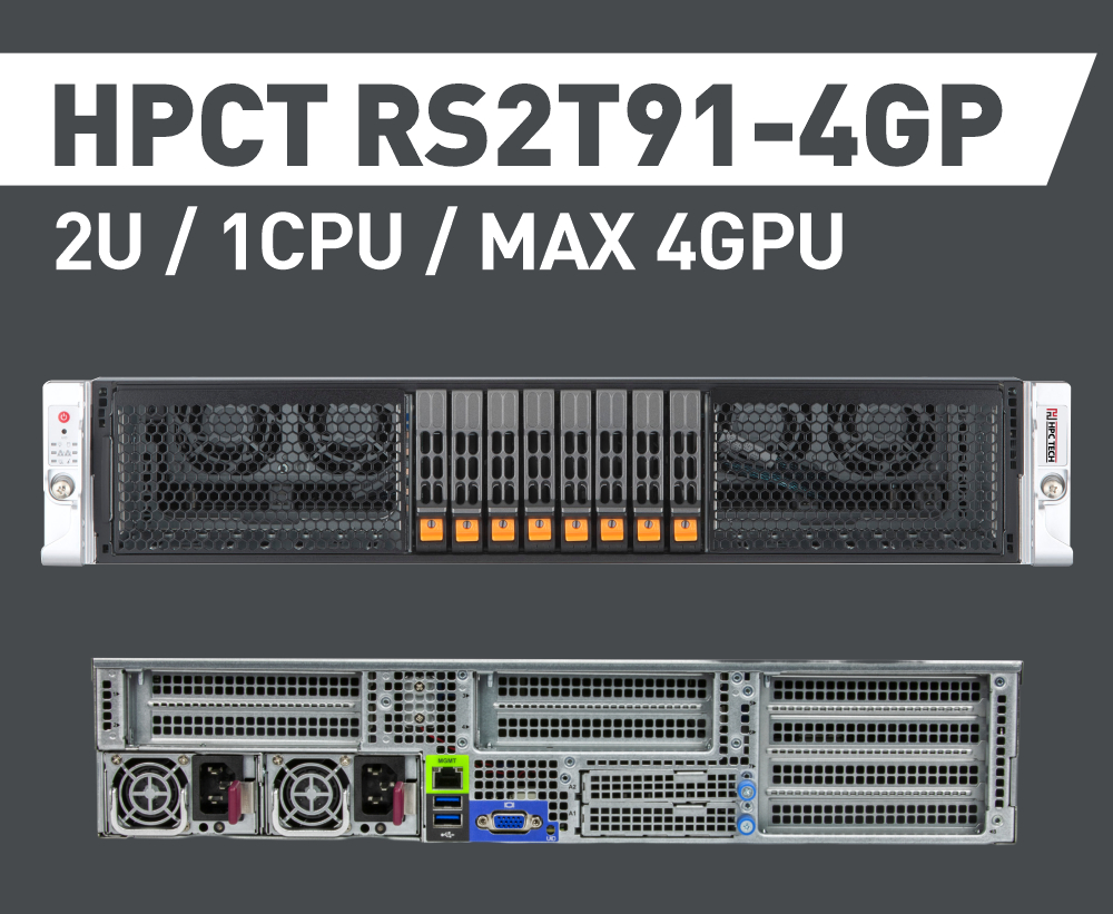 HPCT RS2T91-4GP は AMD Ryzen Threadripper PRO 9000WX もしくは 7000WX シリーズを1基搭載し NVIDIA GPU が最大4基搭載できる 2U GPUラックマウントサーバです。ストレージはホットスワップ 8ベイ NVMe/SATA/SAS に対応しており、ネットワークは 10GbE や 25GbE 等複数から選択することができます。
