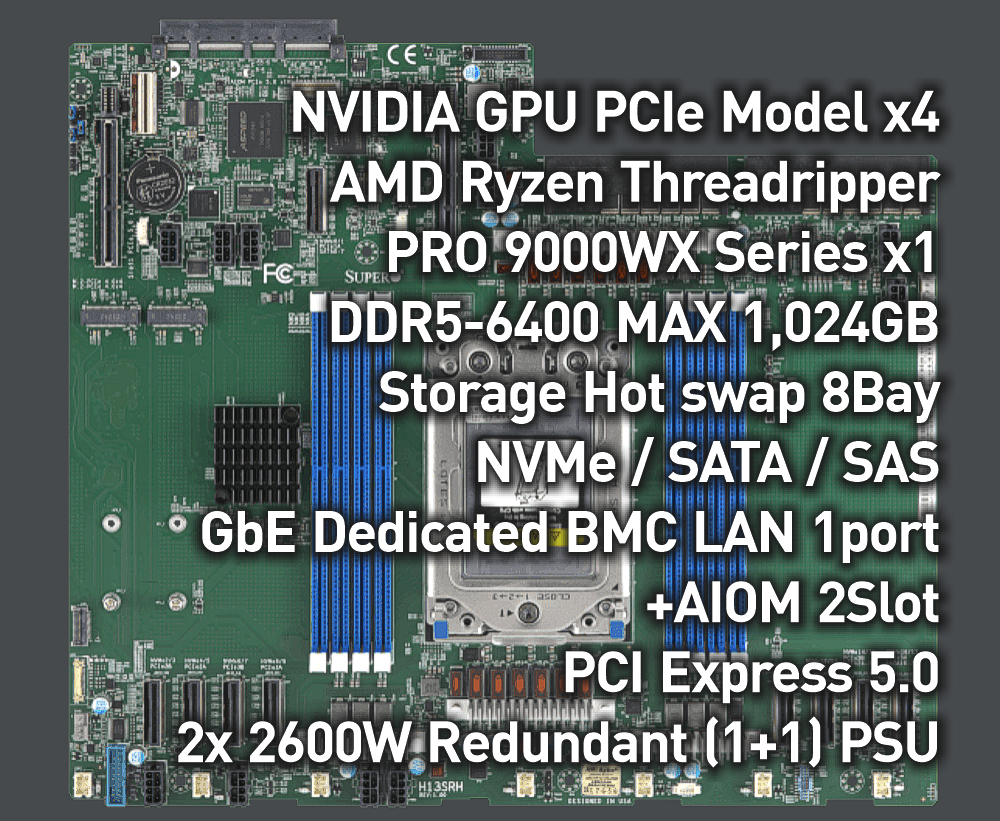 | CPU | ・Single Socket sTR5 (LGA-4844) ・AMD Ryzen Threadripper PRO 9000WX/7000WX series ・Up to 96C/192T; Up to 384MB Cache ・Supports up to 350W TDP CPUs (Air Cooled) |