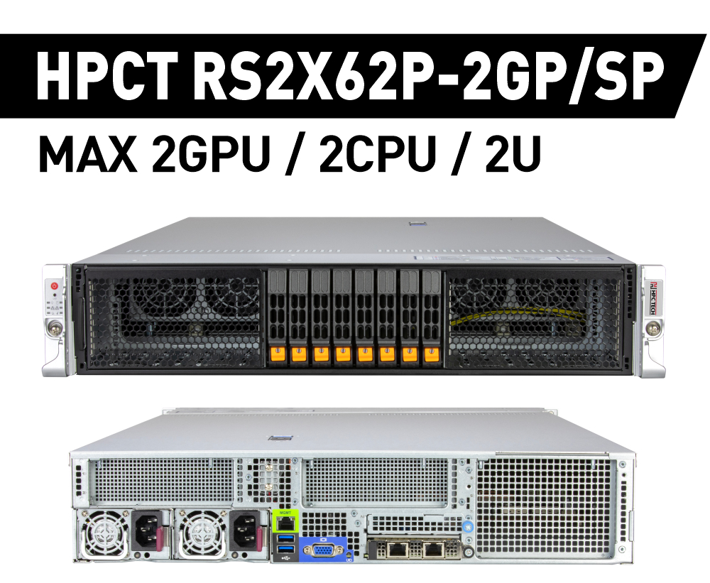 HPCT RS2X62P-2GP/SP は 2基の Intel Xeon 6700/6500 シリーズ(P-cores) と最大で GPUを 2基まで搭載する SPプラットフォーム 2U ハイエンド GPUサーバです。ストレージはホットスワップ 2.5″ NVMe / SAS / SATA に対応、 メモリは最大4096GB(5200MT/s)まで搭載できます。サーバラックや無停電電源装置、ドロワーなどの周辺機器もまとめてご提案をさせていただきますのでお気軽にご相談ください。また、導入後すぐに稼働できるよう HPC テック セットアップサービスをご利用ください。詳しくは営業担当まで。