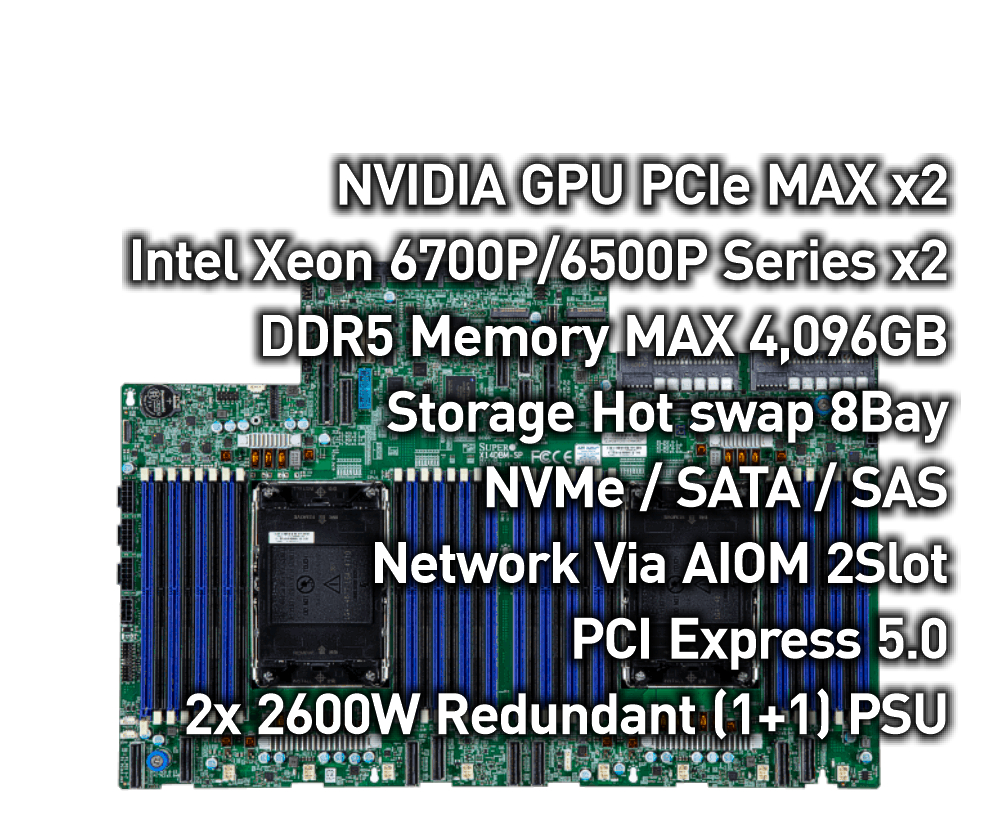 (搭載できる GPUや本数は担当営業までお問合せください) - Intel Xeon 6700/6500 Series with P-Core(開発コード名:Granite Rapids-SP )を2基搭載