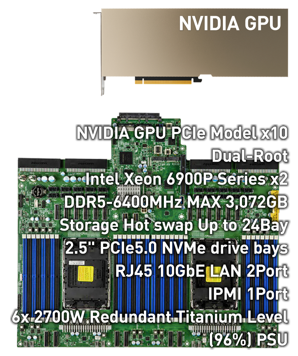 CPU-GPU Interconnect:PCIe 5.0 x16 Switch Dual-Root - Intel Xeon 6900 Series with P-Core(開発コード名:Granite Rapids-AP )を2基搭載