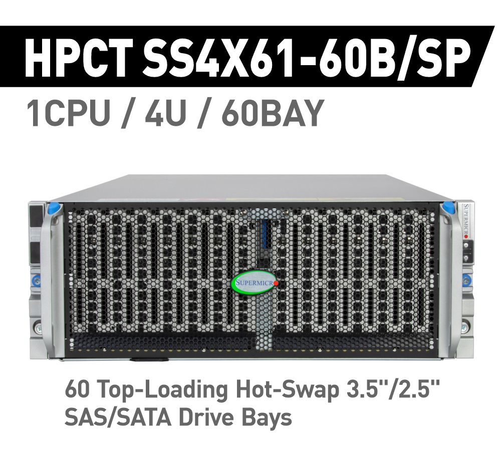 HPCT SS4X61P-60B/SP は 3.5インチ HDD を最大60基搭載することのできる重量級 4U ファイルサーバです。プロセッサにはパフォーマンスに最適化された P-cores(Performance-Cores)を採用した Intel Xeon 6700/6500 Series を 1基搭載し、メモリは DDR5-6400 を最大 2TB搭載することができます。