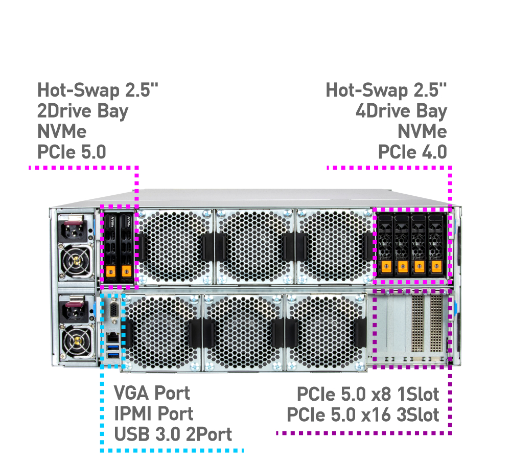 Hot-swap 2.5″ NVMe drive Rear 2Bays - RJ45 1GbE Dedicated BMC LAN 1Port