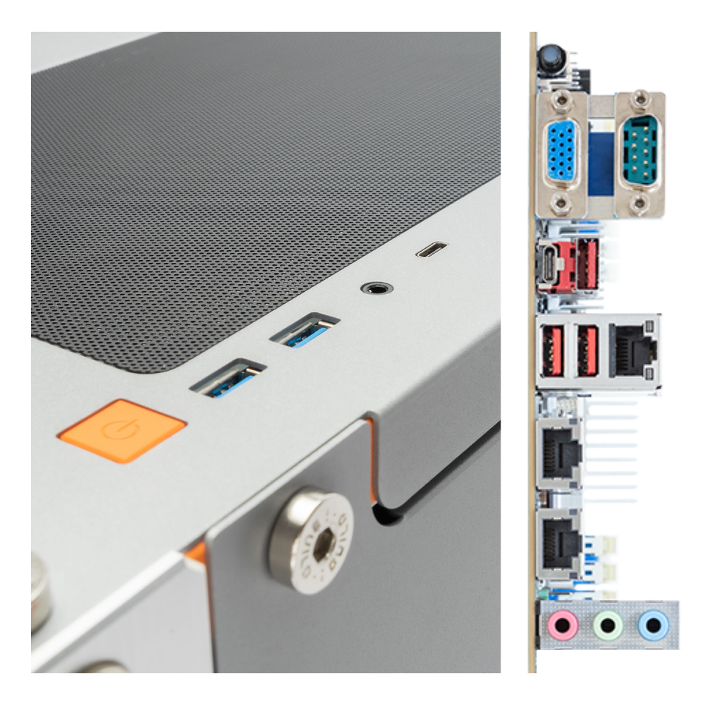 | Rear I/O | ・1 x USB 3.2 Gen2x2 (Type-C) (from FCH) ・3 x USB 3.2 Gen2 (Type-A) (from CPU) ・1 x VGA ・1 x COM ・2 x RJ45 ・1 x MLAN ・3 x Audio jacks (Audio in/Audio out/Mic) ・1 x ID button with LED |
