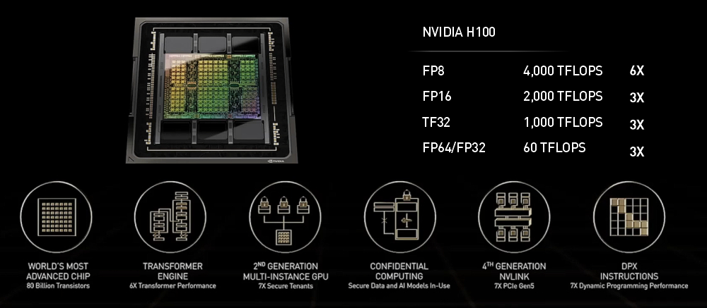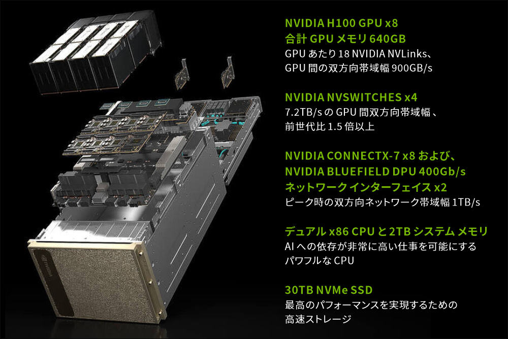 Hopperアーキテクチャ NVIDIA H100 GPU を 8基搭載