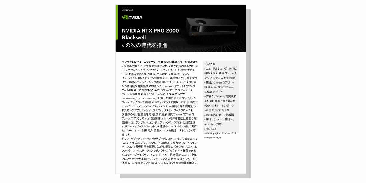 NVIDIA RTX PRO™ 2000 Blackwell は電力効率に優れた小規模フォームファクターのソリューションで、プロフェッショナルなグラフィックスと AI ワークロードの高速化を実現します。 画期的な Blackwell アーキテクチャと 16GB の超高速 GDDR7 メモリを搭載し、エッジ推論と AI 強化ツールを活用して複雑なマルチアプリケーションワークフローをシームレスに向上させ、デスクトップに留まらない大規模な作業環境を構築します。